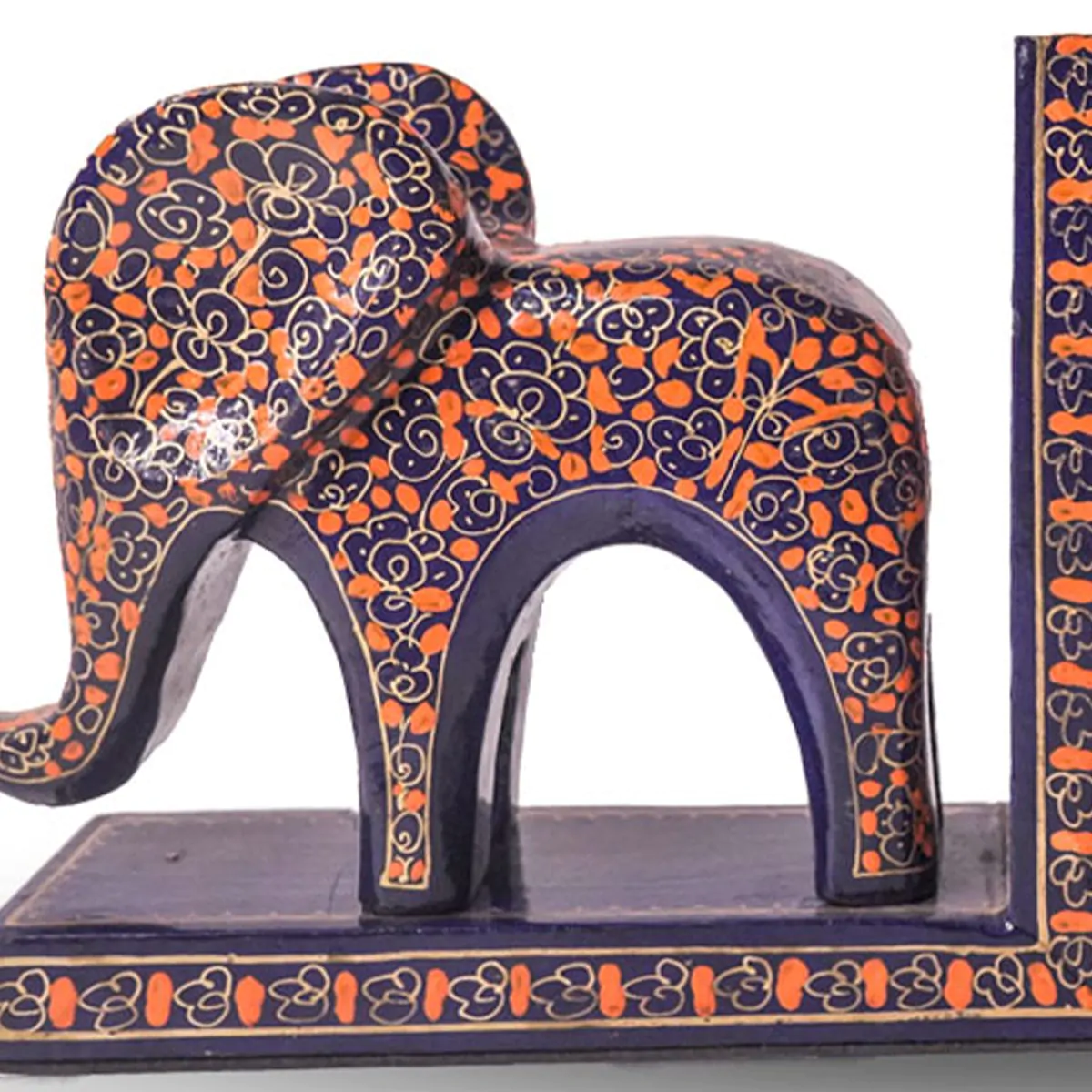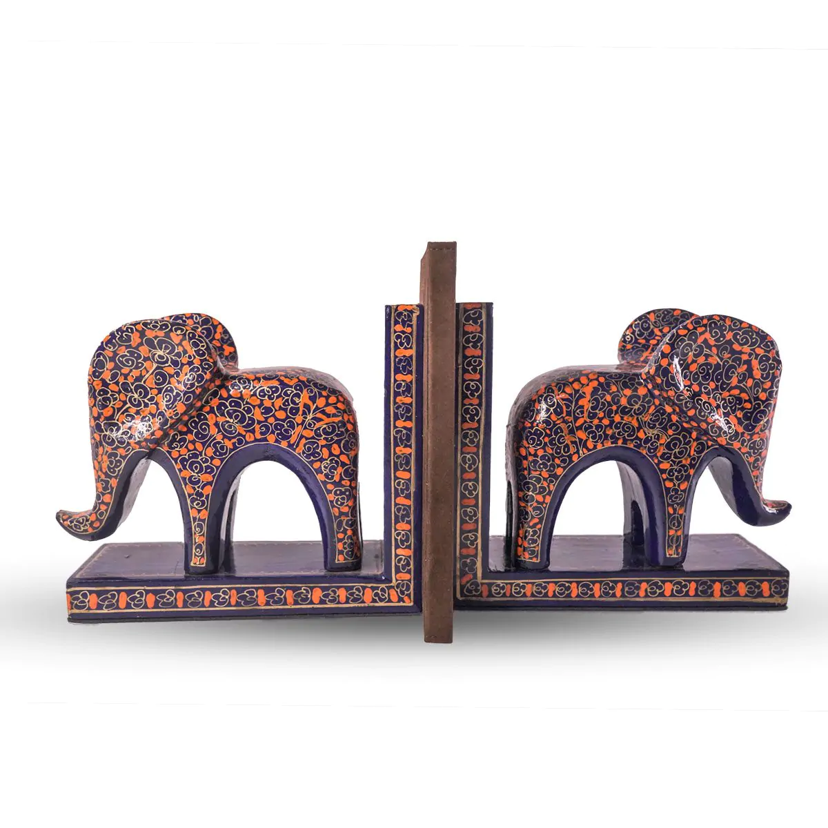 Handcrafted Kashmiri papier-mâché elephant bookends, painted with intricate floral motifs by master craftsmen of Kashmir, reflect a centuries-old technique rooted in patience and precision. Made from recycled paper pulp, moulded, sun-dried, and hand-painted with natural pigments, the craft is finished with lacquer for added durability and a sheen. Reimagined for contemporary living, these bookends blend art with function—adding cultural depth, sustainable design, and elegant organisation to modern homes.