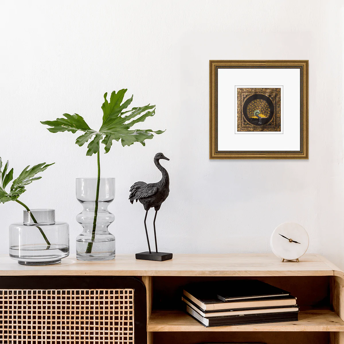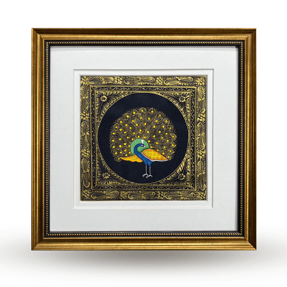 A detailed miniature painting of a peacock is framed by fine patterns, its elegance and symmetry echoing the refined decorative language. Originating from Rajasthan, miniature painting is created with hand-ground natural pigments applied using ultra-fine brushes made from squirrel hair. Painted on paper or silk with meticulous layering, the art form is celebrated for its precision, patience, and timeless craftsmanship.