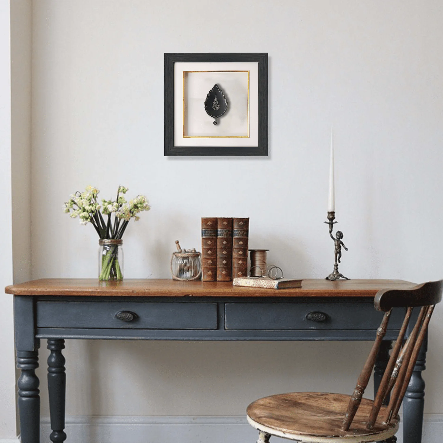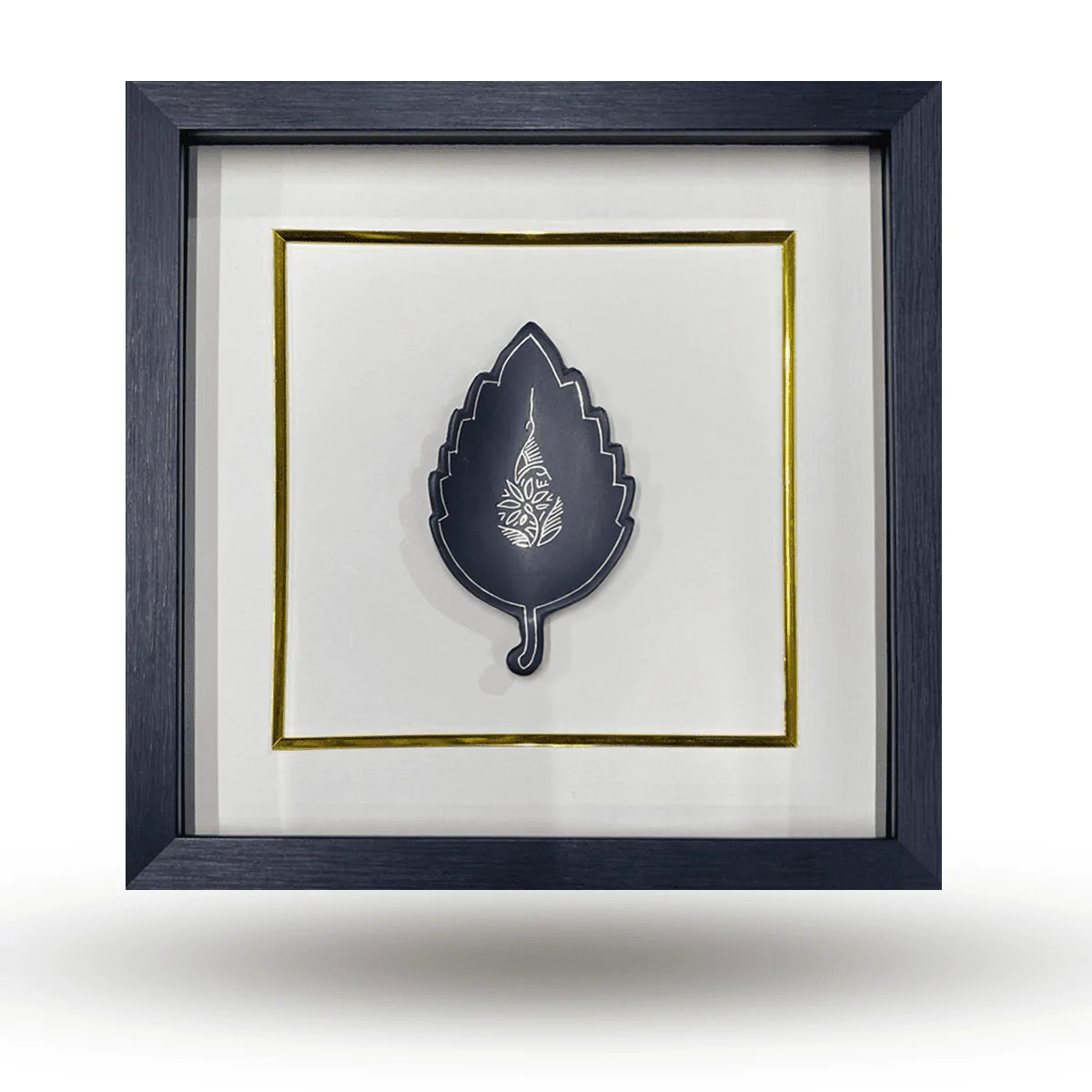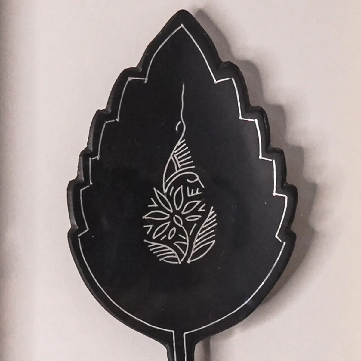 This Bidri artwork features a leaf rendered in silver inlay on deep black metal, its clean, minimal form highlighting refined elegance and craftsmanship. Originating from Bidar, Bidri is crafted from a zinc–copper alloy, darkened using a special soil native to the region. Intricate silver inlay is then hand-set into engraved grooves, creating the striking contrast that defines this historic art form.